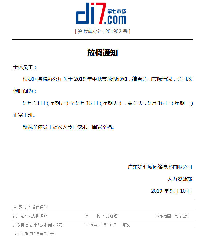 假期將至,首先向全體員工致以節(jié)日的問候,為了度過歡樂、祥和、平安的節(jié)日,根據(jù)國務(wù)院辦公的關(guān)于2019年中秋節(jié)放假規(guī)定,并結(jié)合公司實(shí)際情況,現(xiàn)對中秋節(jié)放假做如下安排: