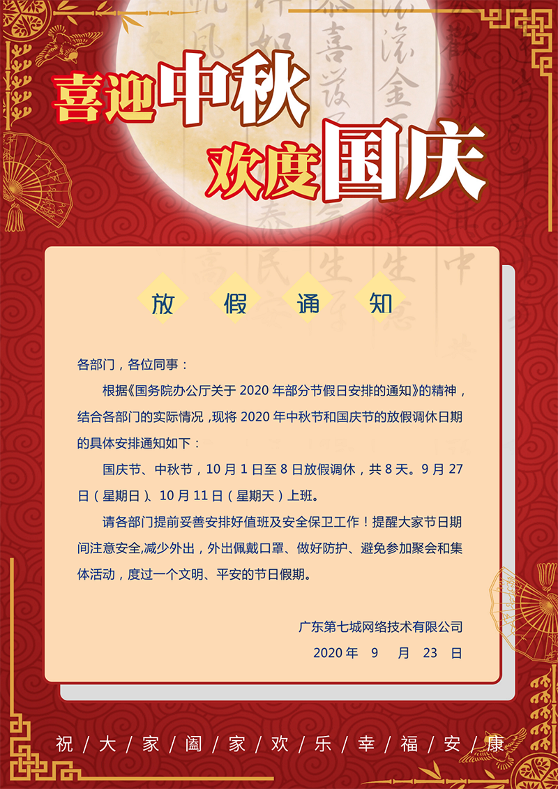第七市場(chǎng):喜迎中秋 歡度國(guó)慶 2020年中秋國(guó)慶放假通知