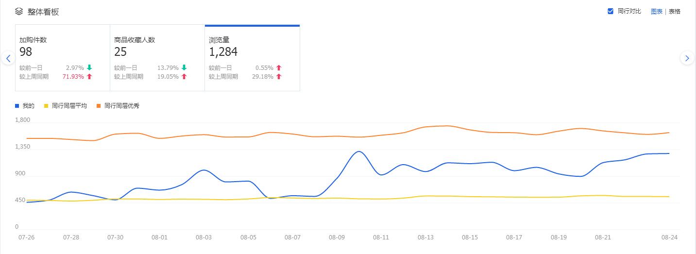 緊接著在和同行平均去比較一下,因?yàn)槟阋⒁?。?jīng)過(guò)了以上的分析,只是代表你的寶貝在你的店鋪中算是優(yōu)秀的。但是,能不能夠成為爆款還是要跟同行去對(duì)比。在跟同行對(duì)比的時(shí)候,你只需要跟同行同層均值比就可以了,需要比的指標(biāo)其實(shí)就是常規(guī)指標(biāo):轉(zhuǎn)化率、客單價(jià)等等。這些數(shù)據(jù)都是可以看到的,你要做的就是你的單品指標(biāo)至少要是同行同層均值的量倍,這黃色的線就是同層同行均值